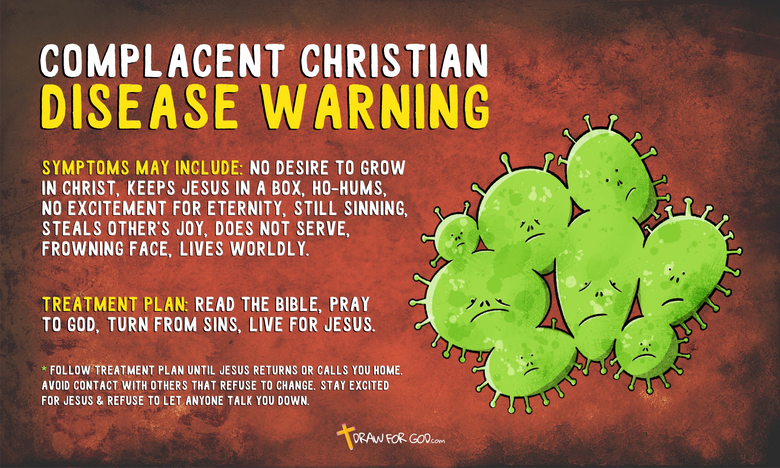 Complacent Christian Disease Warning! This is a serious issue with so many Christians today. They are burned out, don’t care, and have no desire to follow Jesus. It’s truly an epidemic and highly infectious. Follow the treatment plan and get back on track. Read your Bible, pray to God, turn from your sins, and live for Jesus. God is making you brand new everyday!